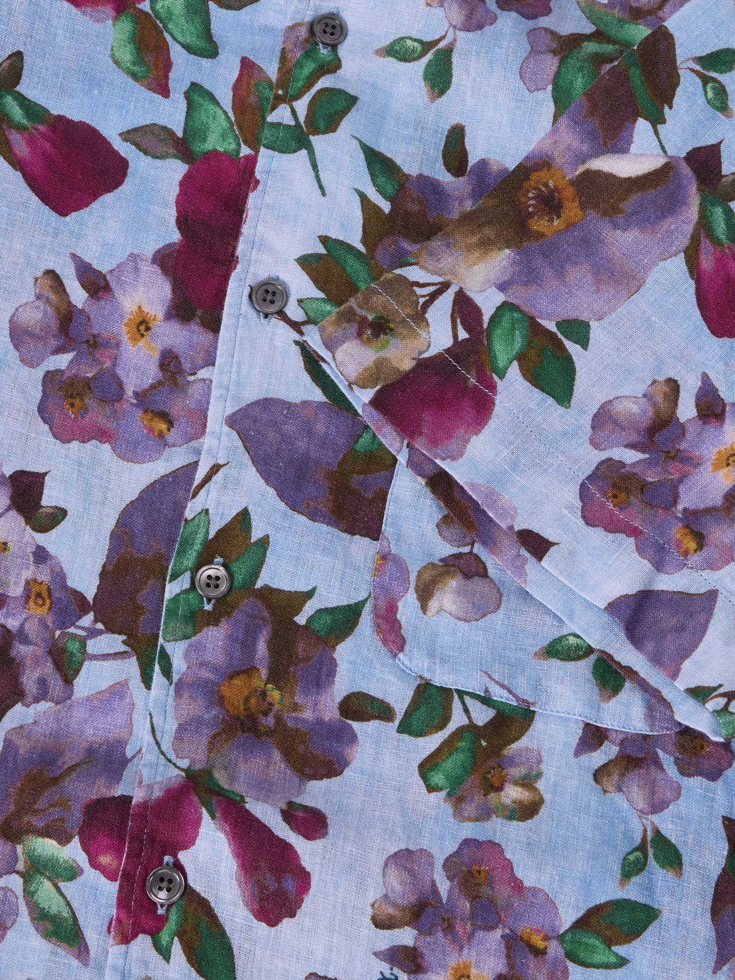 Cut from 100% linen, this short sleeve shirt is designed for warm days and easy wear. The fabric has a naturally breathable, textured hand that softens with wear and performs well in warm conditions. A printed floral brings visual interest while remaining easy to style. The California one-piece collar with a hidden button-down keeps the silhouette relaxed and clean, paired with a French placket, single-needle tailoring, and trocas buttons. Contrast stitching at the bottom buttonhole adds a restrained finishing detail. Light, comfortable, and built for regular summer rotation.