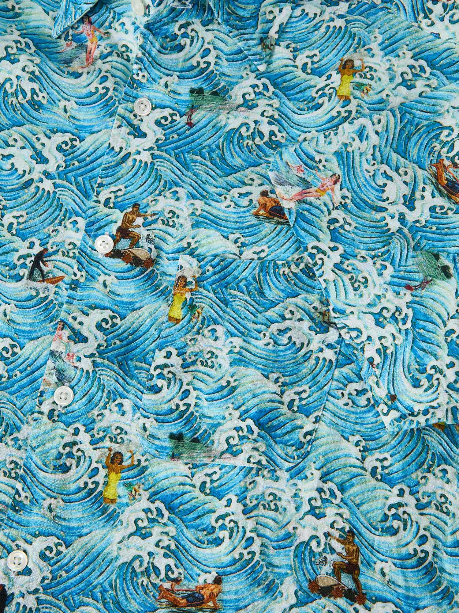 A warm-weather essential made with California luxury in mind. This short sleeve shirt features an iconic surf print throughout and is cut from 100% linen. Lightweight, breathable, and designed for effortless wear, the Morgan features our signature California One-Piece Collar with a hidden button-down for a relaxed yet polished drape. Thoughtfully finished with Trocas shell buttons, a French placket, and subtle signature details, it blends laid-back ease with refined craftsmanship.