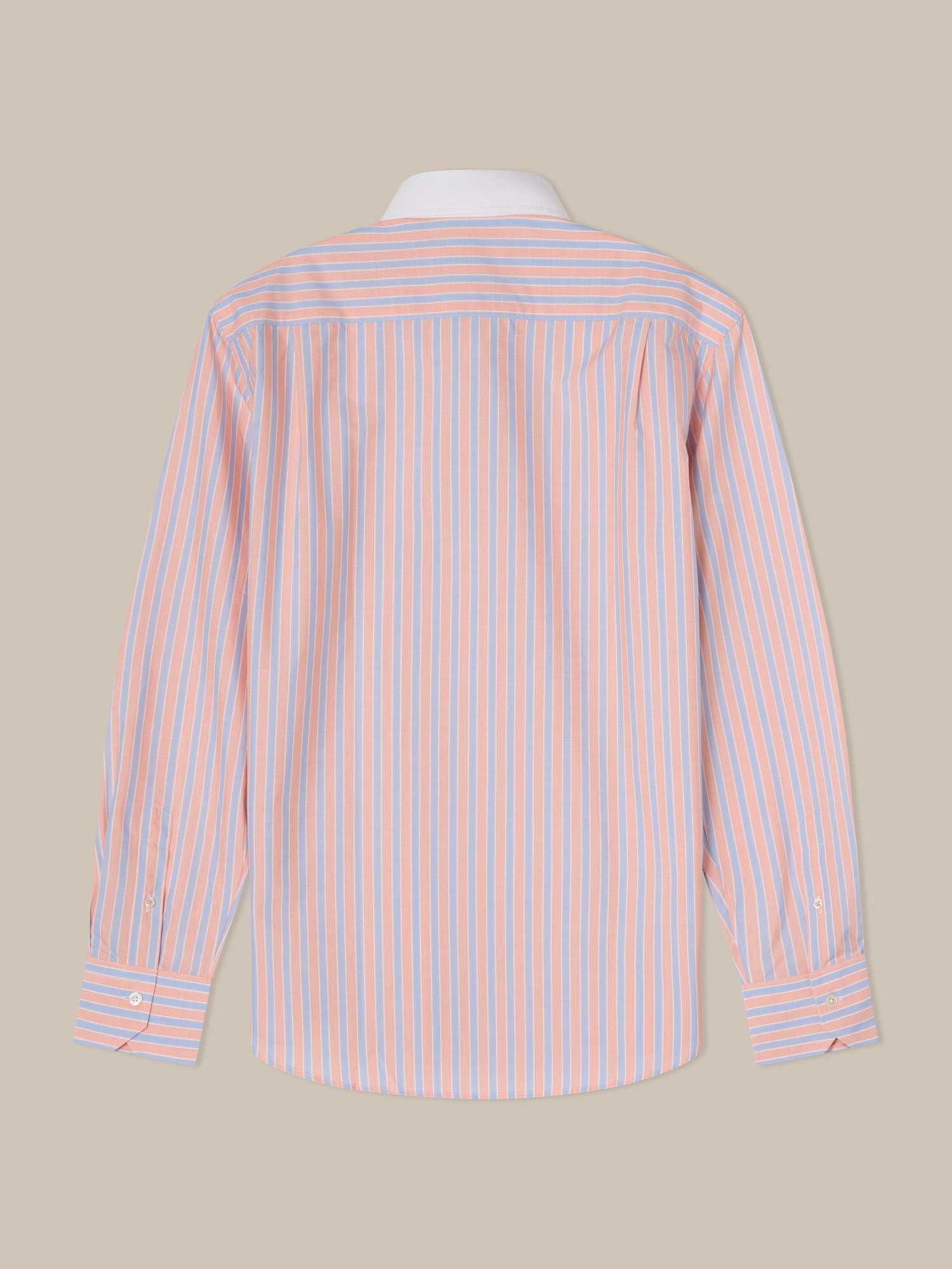 Cut from fine Italian fabric, this shirt is designed for days when you want something crisp, breathable, and easy to wear. The fabric has a smooth hand with an easy-care finish, making it a dependable option for warm weather and travel. A fine multi-stripe pattern adds subtle definition without overpowering the look. Tailoring details include a semi-spread Monterey collar, French placket, and single-needle construction, with a rotated armhole for natural movement. Finished with understated Talbott gold details at the inside neck and buttonholes. Clean, versatile, and built for regular rotation.