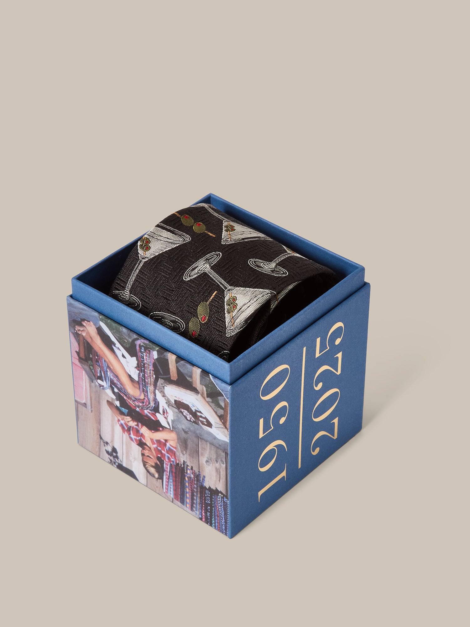 To celebrate 75 years of craftsmanship, we’ve reissued a limited-edition collection of heritage neckties, each one recreated from the Robert Talbott archives. Woven by England’s oldest silk mill and handmade in Lake Como, Italy, these ties carry forward the quality and character that set the brand apart. This cocktail-themed design, first released in 1997, captures the spirit of celebration with understated charm.